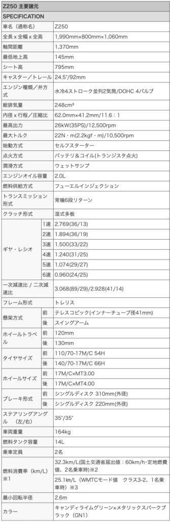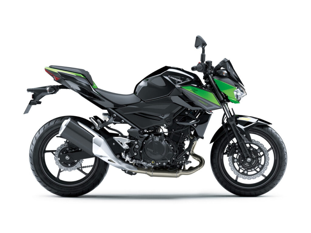 軽さと力強さを併せ持つ本格的スーパーネイキッドマシンZ250。高出力かつ操作性に優れた248cm³パラレルツインエンジンは、全回転域で良好なパワーフィーリングを発揮します。また、車体には軽量でスリムなシャーシを採用。優れた安定性と軽快で自然なハンドリング、扱い易い取り回し性能を獲得しています。加えて、Zシリーズ共通の「Sugomi」デザイン要素が、一目でカワサキのスーパーネイキッドとして認識できるシルエットを形成。アグレッシブかつ俊敏なイメージでライダーを魅了します。