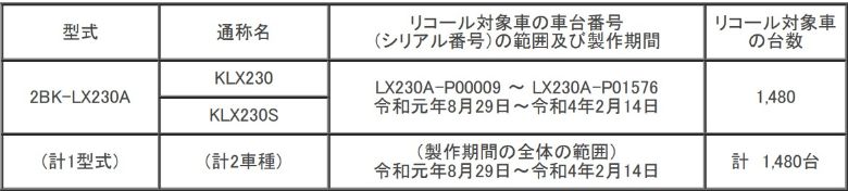 カワサキモータースジャパンは国交省に対し、令和元年8月29日~令和4年2月14日の期間に製作された、「KLX230」および「KLX230S」のリコール届出(5160)を提出した。