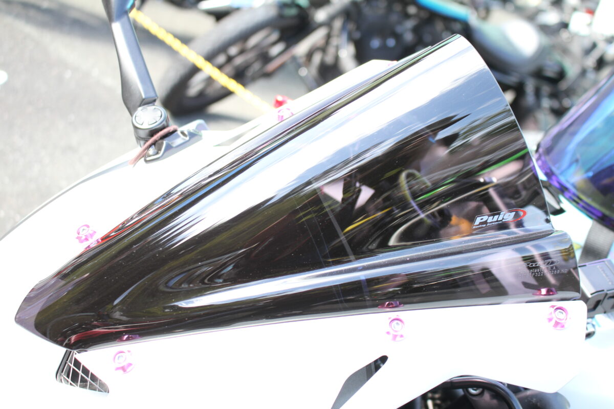 1番のカスタムは、バックステップをBEETでピンクにカラーオーダーした点です。それ以来、イベントでピンクのカスタムパーツを見つけては購入しています。ポッシュフェイスのバーエンド、リヤブレーキのマスターキャップ、タイヤのエアバルブキャップ、メンテナンスフックなど)。