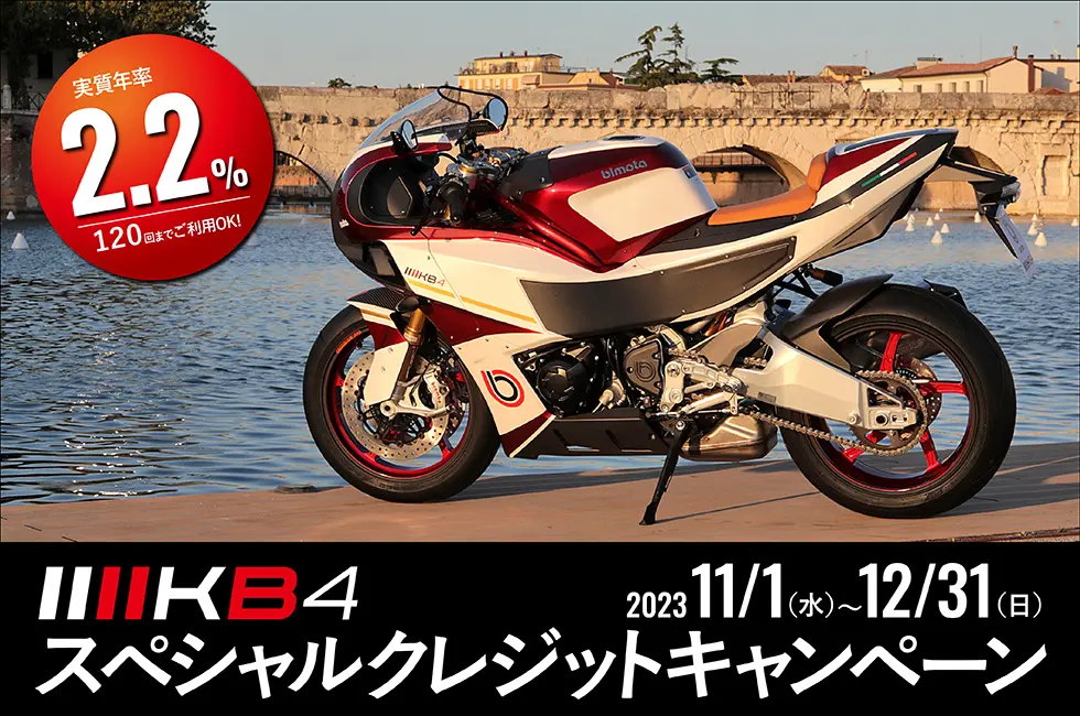 株式会社カワサキモータースジャパン(本社:兵庫県明石市、代表取締役社長:桐野 英子)は、2023年12月31日までBimota正規取扱店にて、Bimota「KB4」新車ご購入時にご利用いただける、実質年利2.2%の「Bimota KB4スペシャルクレジットキャンペーン」を実施いたします。