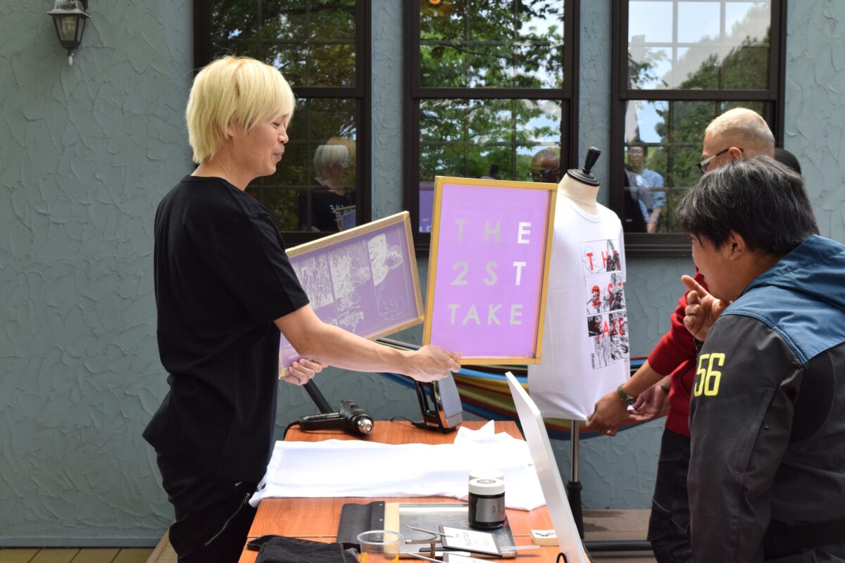 レセプションの前後では、KIICHI氏が展開するTシャツブランド「白いTシャツと黒いバイク。」のライブプリントによるイベント限定Tシャツの販売も行われ、これを目当てに来場する人もいた。