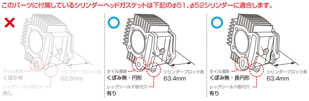 φ51・φ52シリンダー(85cc・88cc・104cc・108cc)のアルミ鋳鉄スリーブシリンダーは過去にモデルチェンジを行っています。それにより、使用するシリンダーヘッドガスケットが異なってきますので、補修の際はご注意下さい。