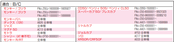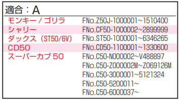 適合:ダックス70(ST70)(全車種)、シャリー70用、シャリー70(FNo.CF70-2000003-2999999)