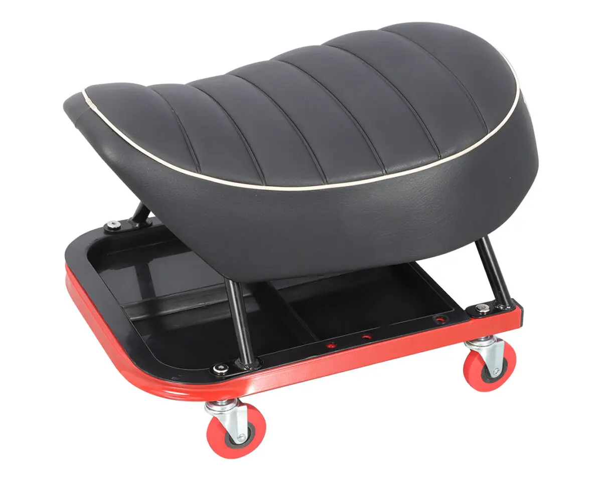 モンキー 125 のシート交換で使わなく なったノーマルシートを再利用。キャス ター付きメンテナンスチェアとして使え る便利なアイテムです。さらに作業に必 要な工具等もチェア下のトレイに置くこ とも可能です。