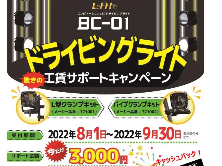 現在好評開催中のコルハート「ドライビングライトBC-01」シリーズの、工賃サポートキャンペーンが締め切り間近となっている。