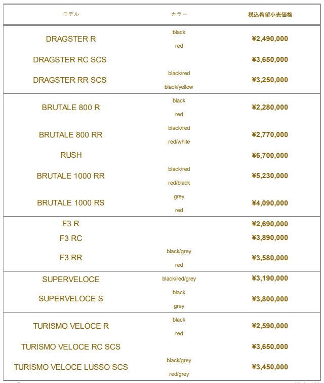 MV Agusta MY23メーカー希望小売価格表(税込み)