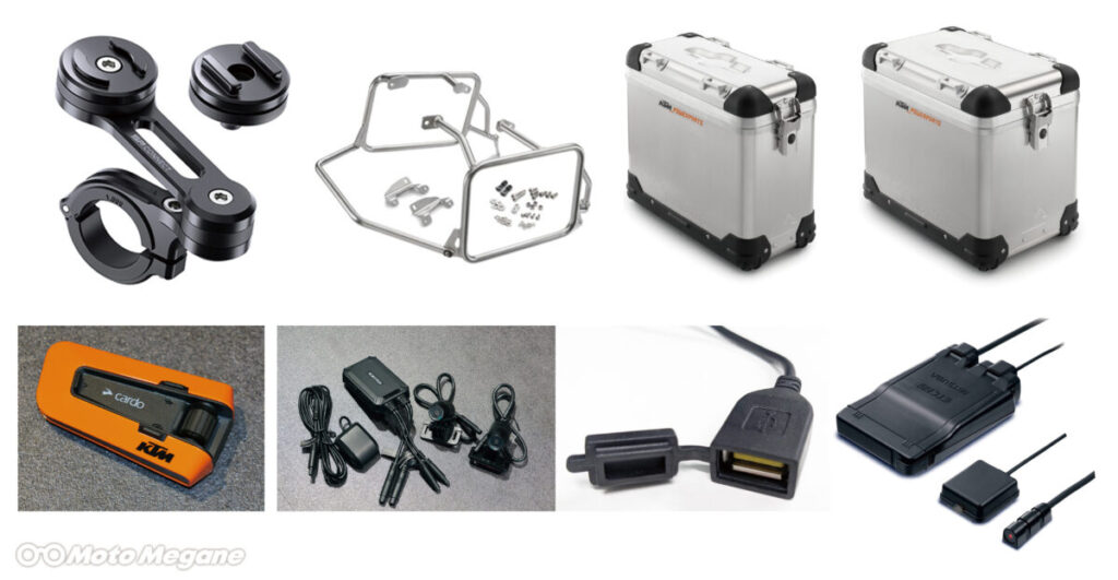 例えば、スポーツパックであれば、バックステップ(ベビーフェイス製)、シングルシートカバー(KTM POWER PARTS)、クイックシフター(KTM POWER PARTS)などをパックにし、個別で装着するよりもお得な価格で装着が出来るというもの。ツーリングパックであれば、ETC車載器、USB電源、スマホホルダーなどがパックに含まれている。