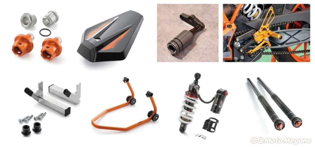 主にKTMのミドルクラス以上のスポーツモデルを対象にしたパック。バックステップやフレームスライダーをはじめ、KTM純正パワーパーツのクイックシフターやレーシングスタンドなどをセレクト。