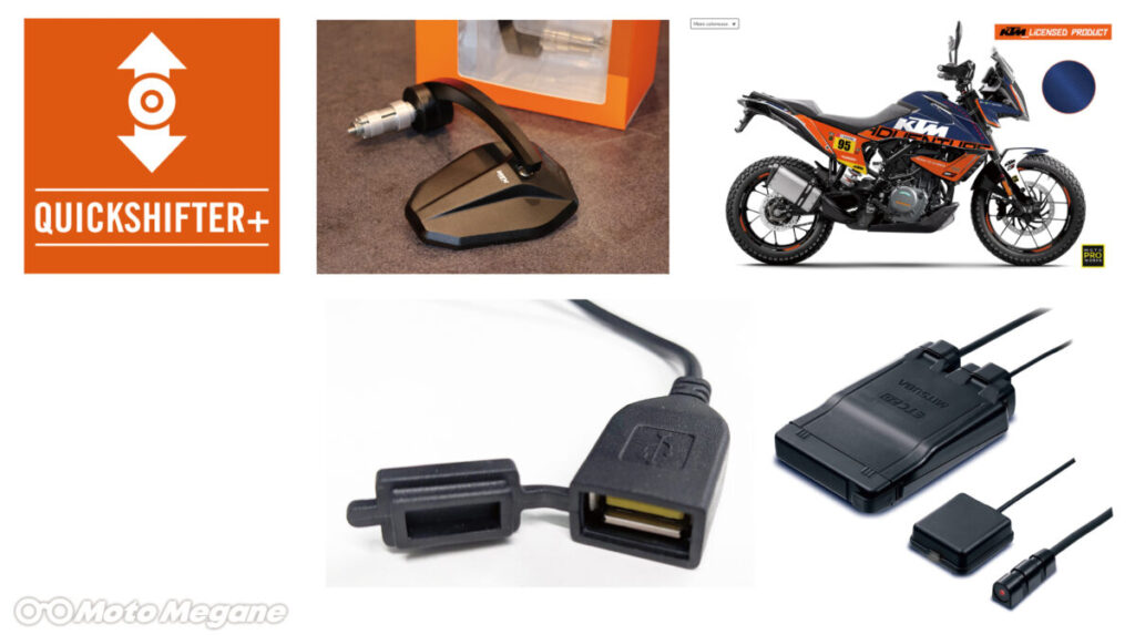 主に街乗りで便利なアイテムをセレクト。デカールキット、バーエンドミラー、ETC車載器、、KTM TOKYOベイオリジナルUSB電源、そして通常はオプションのクイックシフターなどが含まれている。