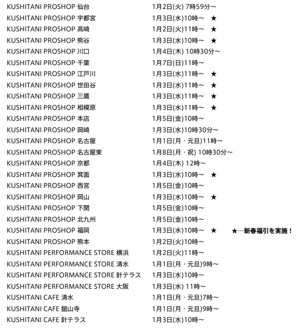 KUSHITANI PROSHOP 名古屋 1月1日(月・元旦) 11時~