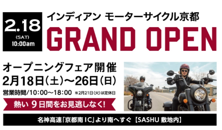 【2/18(土)グランドオープン】京都初!インディアンモーターサイクル京都 オープニングフェア開催!来場記念品もご用意しております!