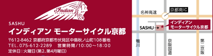 「インディアンモーターサイクル京都」は、国道1号線沿い、名神高速道路の京都南インター出口の目前に位置する京都府初のインディアンモーターサイクル正規ディーラーで、国内20カ所目のインディアンモーターサイクル販売拠点となります。各特典もご用意していますのでぜひお立ち寄りください。