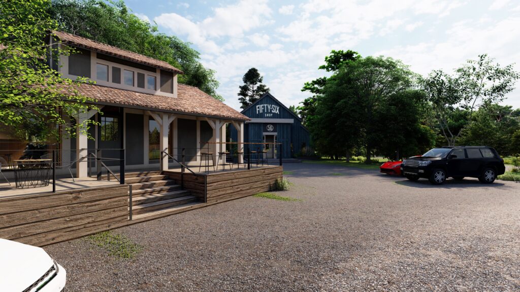 「LAKESIDE TERRACE」は、本格的なコーヒーとピッツァを提供する 「Fioretto(フィオレット)」と、56design のオリジナルバイクアパレルを中心としたバイク用品を展示する「56design ショールーム」の複合施設。