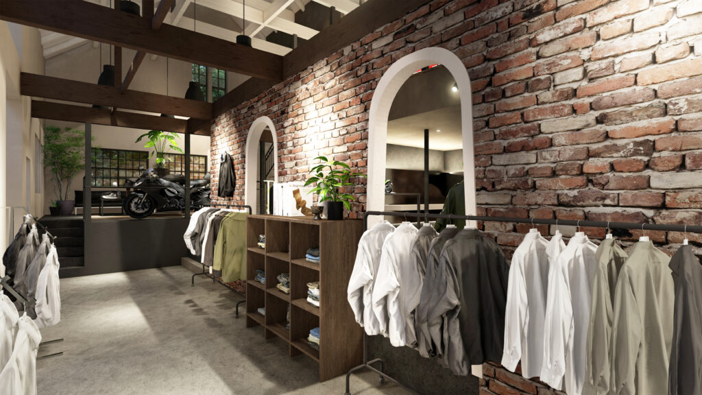 LAKESIDE TERRACE 内に併設するショールームでは、56design オリジナル製品を中心に、SPIDI, XPD, BREMA などのアパレルに加え、rizoma パーツやさまざまなバイク用品を展示。
