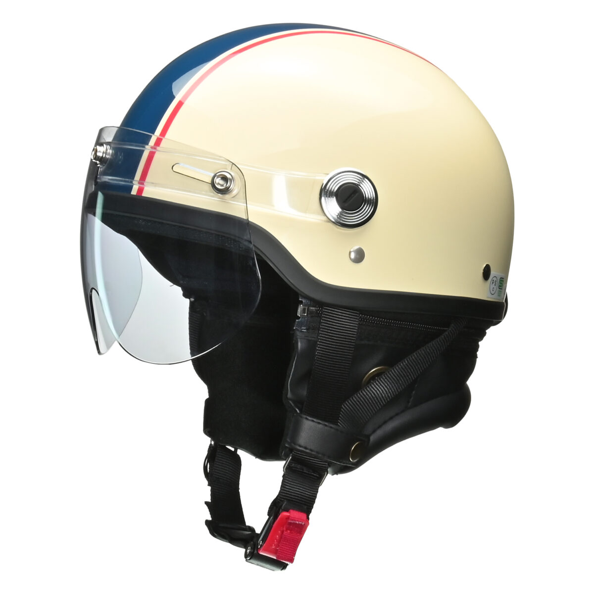 イヤーカバー付きハーフヘルメットに開閉式のハーフシールドを装備したモデル。ハーフシールドの素材は強靭なポリカーボネイトを採用。ハードコート・UVカット仕様。全天候に対応したライトスモークシールドを標準装備。