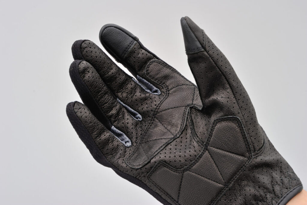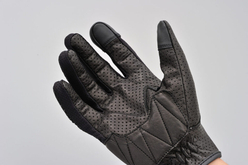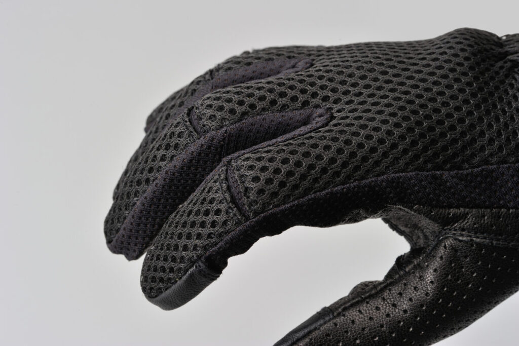 手の甲側は通気性とストレッチ性に優れたメッシュ素材、手の平側は全面パンチング加工を施した本革を採用。指股には通気性に優れるストレッチ素材を採用することで、高いフィット感、通気性と安全性を両立。真夏でも快適にライディングできます。