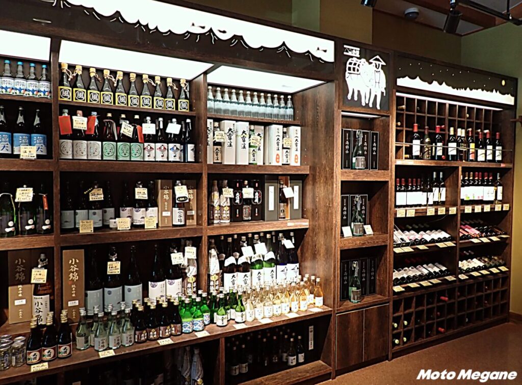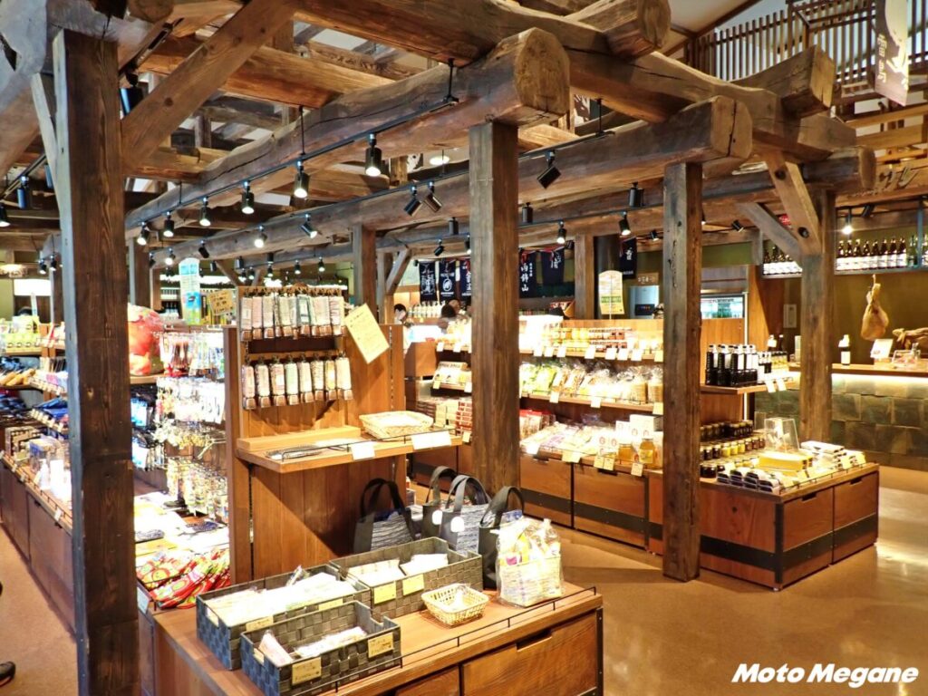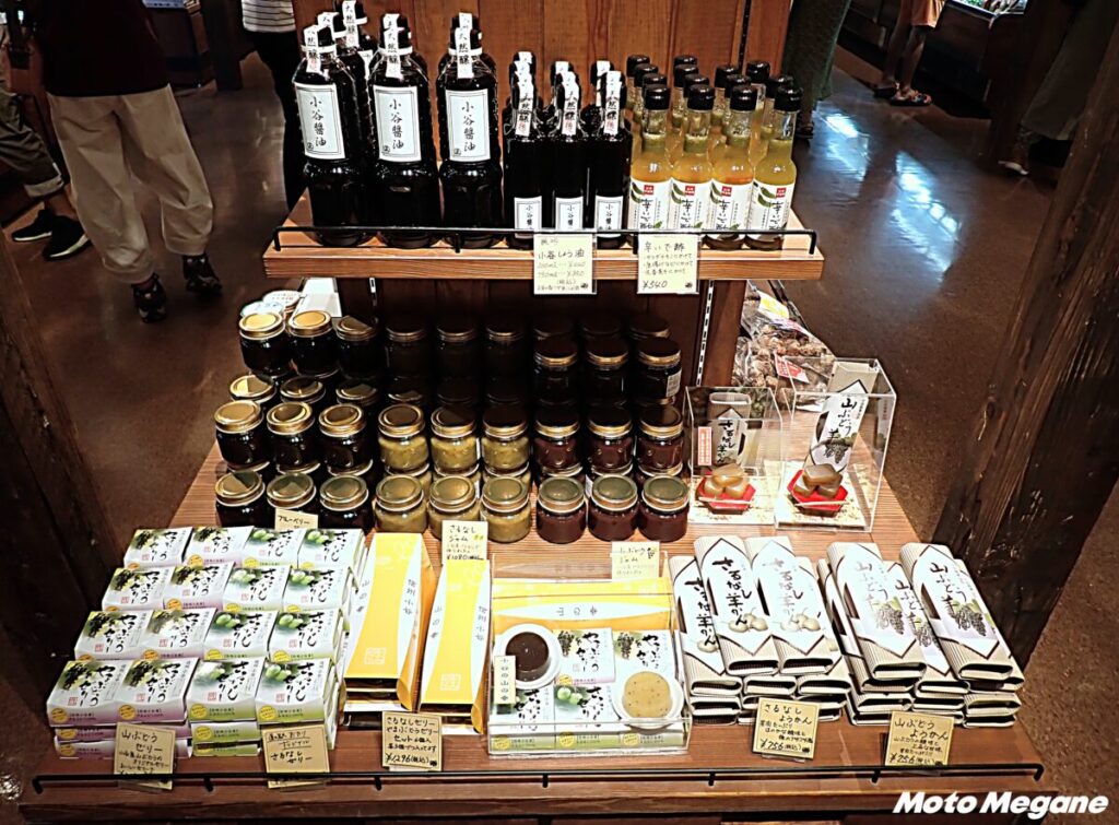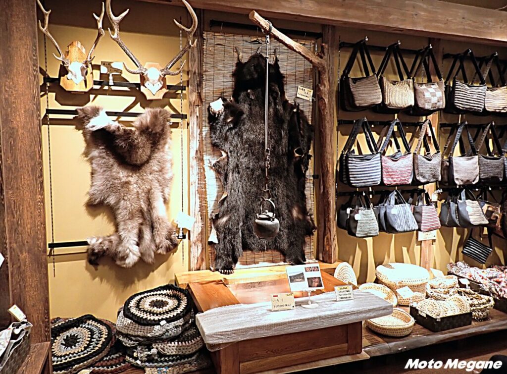 売店は、古民家の古木を使用した内装で、木の温もりと趣のある店内。特産のさるなしや山ブドウを使った商品、ソバ、味噌、おやきなどの特産品や地酒のほか、猫つぐらや、ぼろ織などの工芸品やクマの毛皮なども販売している。