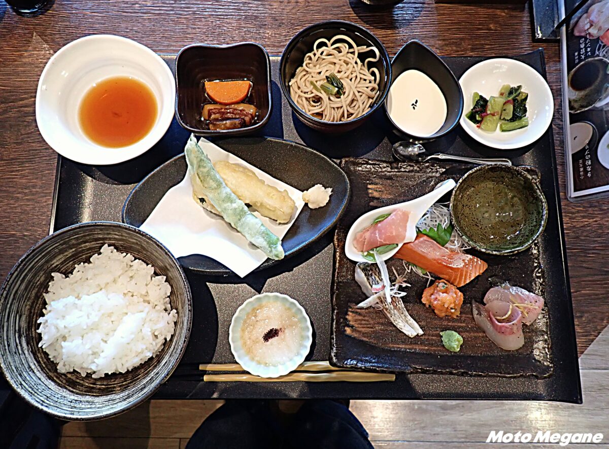 食事処イチオシメニュー。信州サーモン、大岩魚、信濃ゆきます、小谷産の野豚やソバ粉、大豆や旬の野菜など、小谷と信州の食材がふんだんに使われている。かまど炊きご飯、野沢菜漬けはおかわり自由だ。数量限定品。