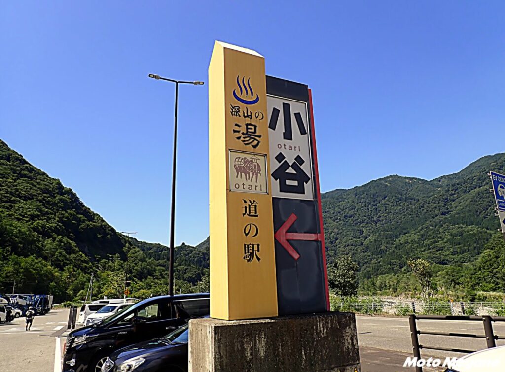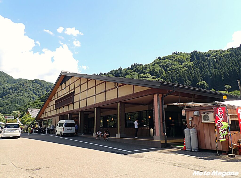『道の駅 小谷』は小谷村北部の山間地域に位置。R148沿いにありアクセスは抜群。広い駐車場内には、バイク用の駐輪場が2カ所設けられている。売店、食事処、日帰り温泉施設からなる道の駅で、1階建ての平屋の建物だ。正面中央入口を入ると、エントランスを挟んで右側が食事処、左側が売店となっており、一番奥に温泉施設がある。