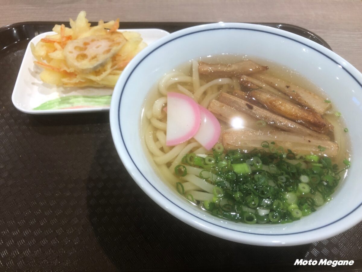 白石町産のレンコンがトッピングされているうどん。レンコンは縦にカットされたスティック状になっており、季節ごとのレンコンの食感を楽しめるようになっている。