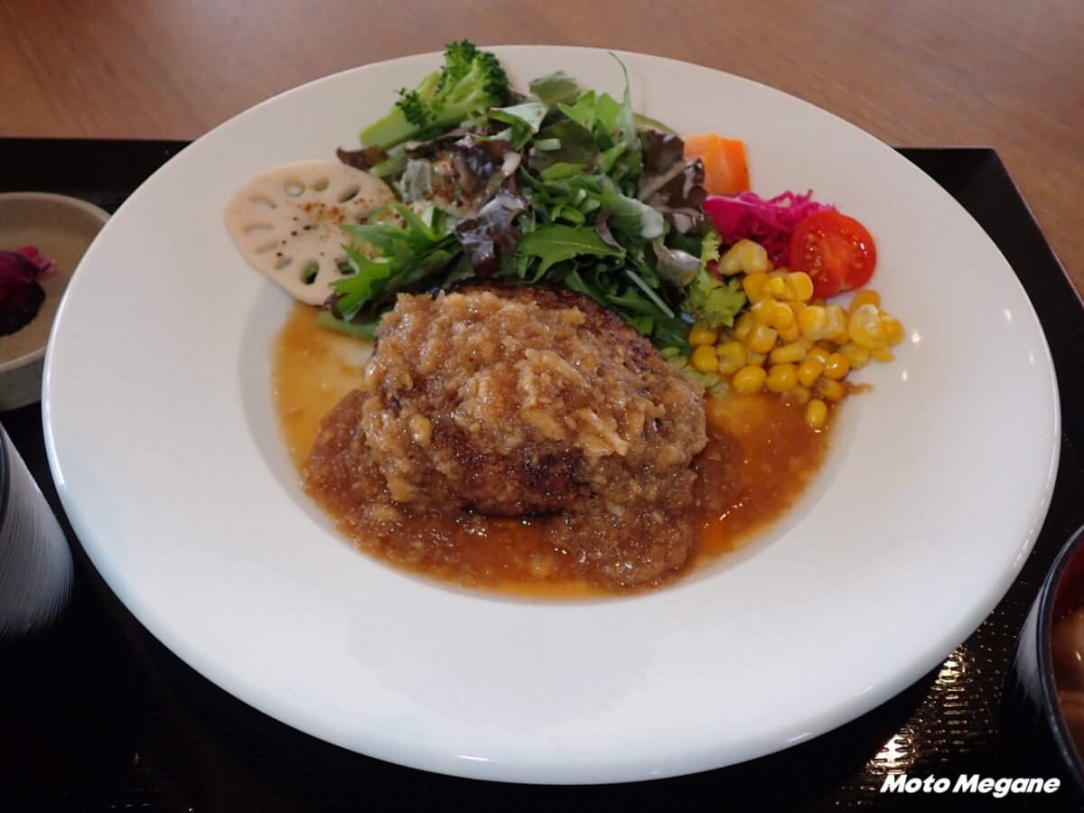 白石町産のレンコンが練り込まれており、レンコンのシャキッとした食感がアクセントになったハンバーグ。ふっくらジューシーで、外はカリッと焼かれており、食べると口の中に旨味が広がる。玉ねぎがふんだんに使われたソースでさっぱりといただける。