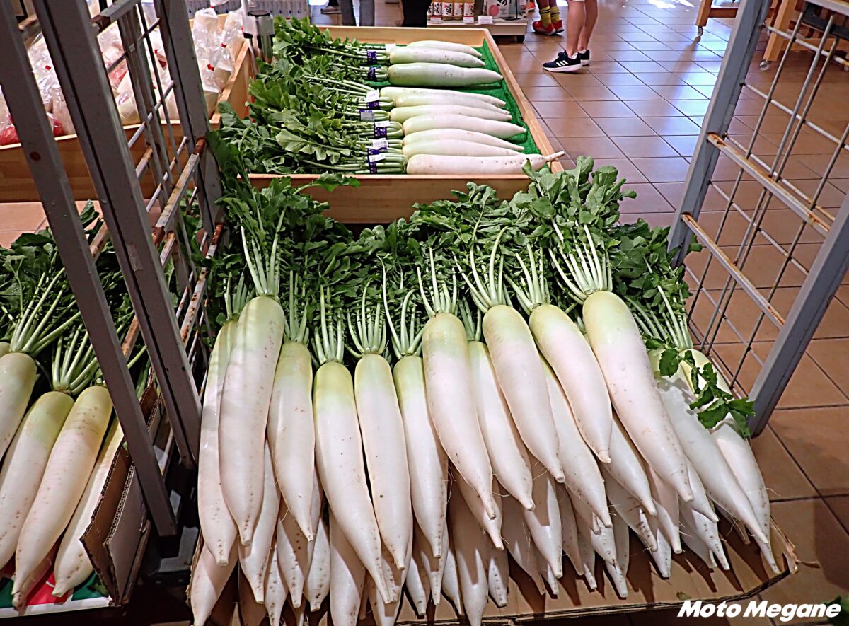 高野町でリンゴと並んで盛んに栽培されている「高野大根」。高野町は標高500~900mの高冷地で、昼夜の寒暖差が大きいことと、火山灰土の肥沃な土壌でおいしい大根に育つという。張りがあり、みずみずしさが特徴の大根は、生食にもおでんなどの煮物にも向いている。直売所では葉付きの新鮮な大根が人気のほか、切り干し大根や漬物などの加工品も豊富に販売する。