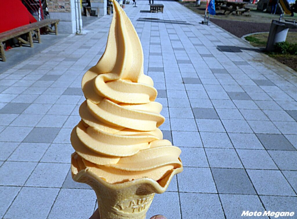 屋外カフェでは、ご当地ソフトを満喫できる。地元産サンシャイントマトジュースのソフトクリームは、トマトの風味が抜群でさっぱりとした後味。暑い日にもピッタリのソフトクリームだ。