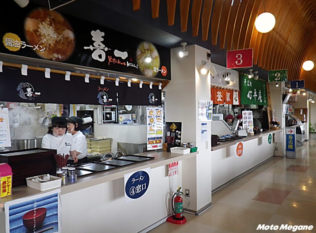 2階のフードコートには、寿司処、そば処、釜飯店、喜多方ラーメン店の4店があり、バラエティ豊かなグルメを味わえる。海の見えるカウンター席やテラス席も用意され、広大な太平洋を眺めながら食事を楽しめる。寿司処では四倉・久之浜港から直送の常磐ものの魚介を使った握り寿司やちらし寿司を堪能できるほか、ソースカツ丼に魚介をプラスしたミックスソースカツ丼が人気。釜飯店の1番人気は海鮮釜飯だ。あぶくま高原産そば粉の二八そばが自慢のそば処と、ご当地グルメの宝庫となっている。