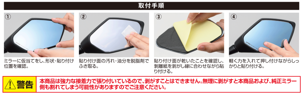 ●強力両面テープを使用しておりますので、貼り直しはできません。位置決めなど慎重に行なうようにしてください。無理に剥がそうとした際は、ミラーの破損、ケガの恐れがあります。絶対に行なわないでください。
