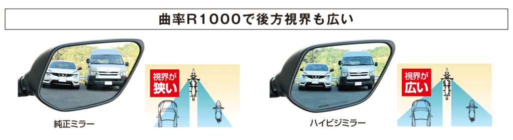 ●本商品は、ワイドミラータイプとなっております。遠近感が純正ミラーと異なります。慣れるまで慎重に運転するように心がけてください。