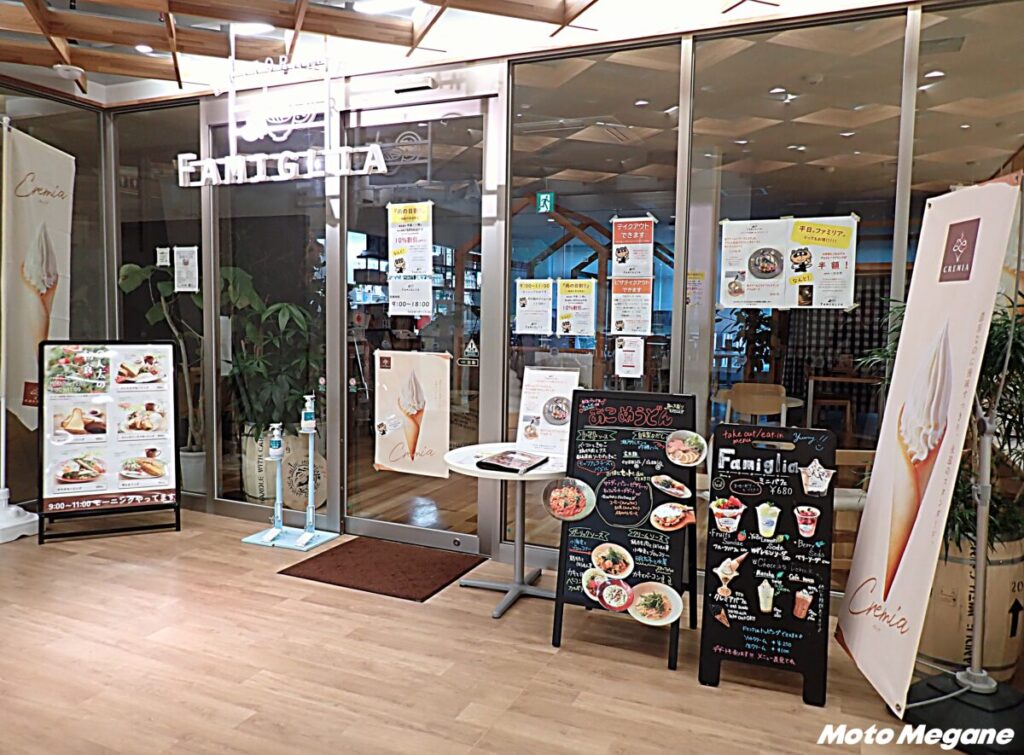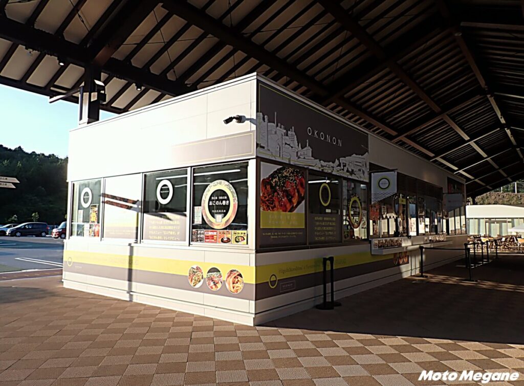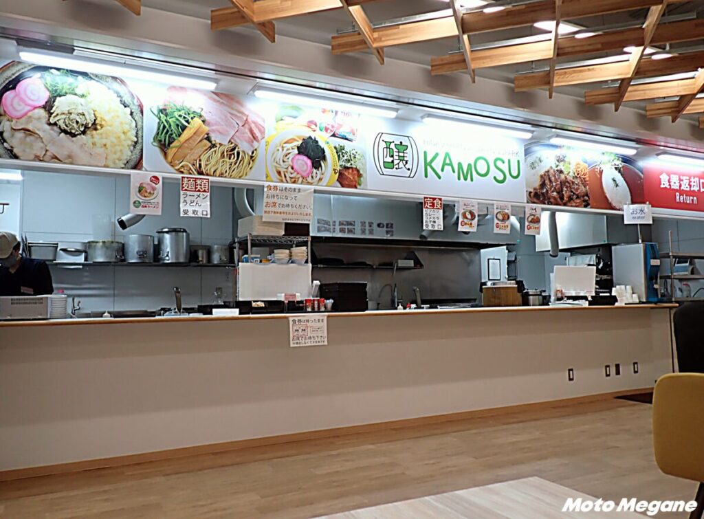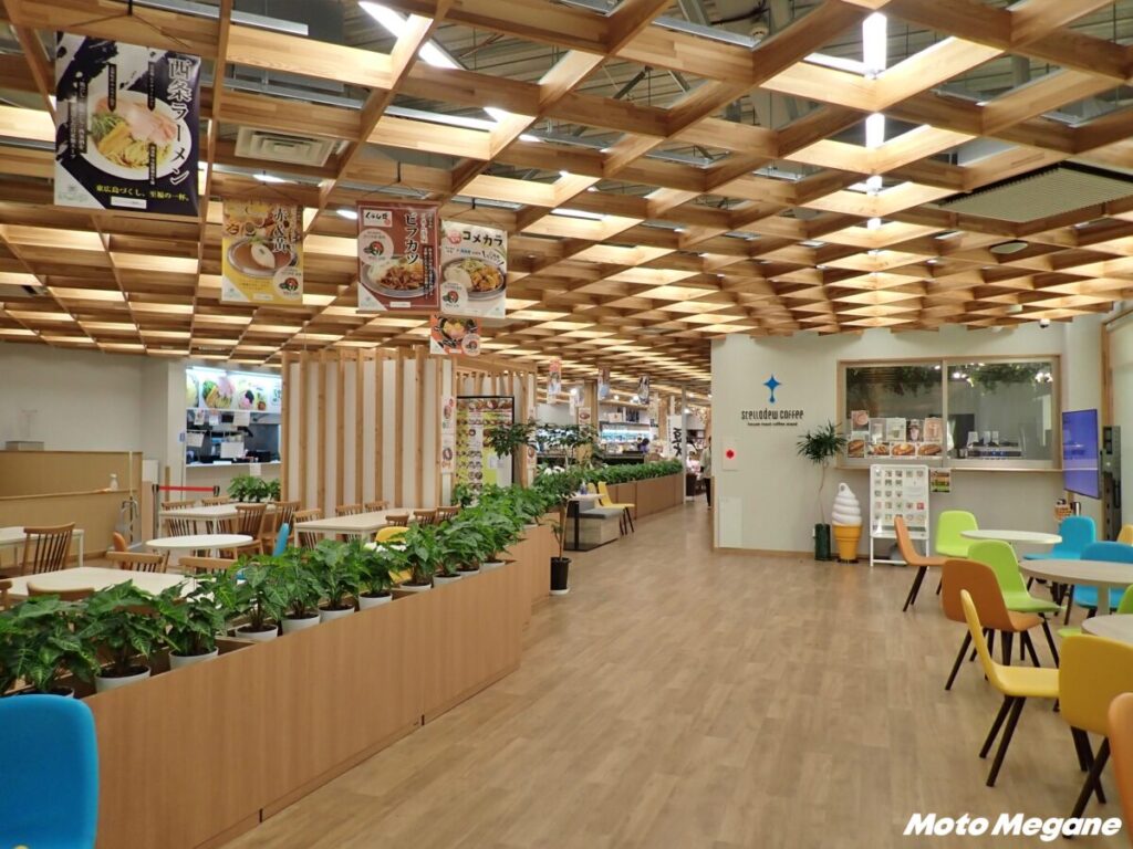 フードコート、レストランやテイクアウト店など多彩な店舗で、東広島のグルメを堪能できる。フードコートではご当地食材を使用した「西条ラーメン」や、市内老舗店舗とコラボしたメニューなどを味わえる。フードコートはラストオーダーが19時30分と遅めなので、ツーリングの帰り道でも食事ができるのが嬉しいポイント。