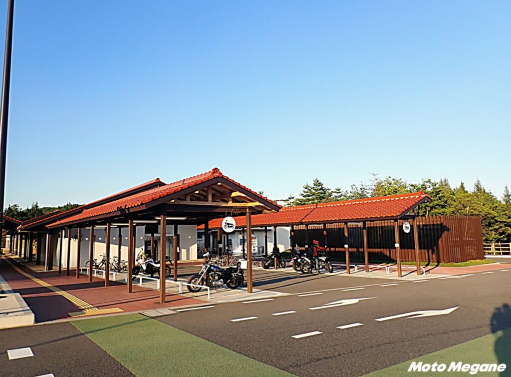 『道の駅 西条のん太の酒蔵』は2022年7月にオープン。「ひと・まち・もの・とき」が交わる「東広島のゲートウェイ」がコンセプトとなっている。R2バイパスにすぐそばに立地し、アクセスは抜群。駐車場は広く、屋根付きのバイク用の駐輪場も用意されている。なまこ壁、赤レンガの煙突のある外観は、市内にある酒蔵を思わせる雰囲気だ。