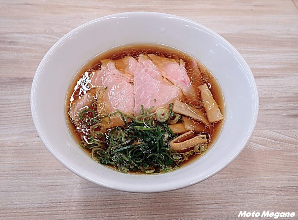 スープに西条の日本酒を使用したご当地ラーメン。スープはあっさりとした醤油味で、鶏だし、和風だし、西条酒を使った自家製スープ。地元製麺所の生麺に、志和町のサムライネギと自家製レアチャーシューがトッピングされている。