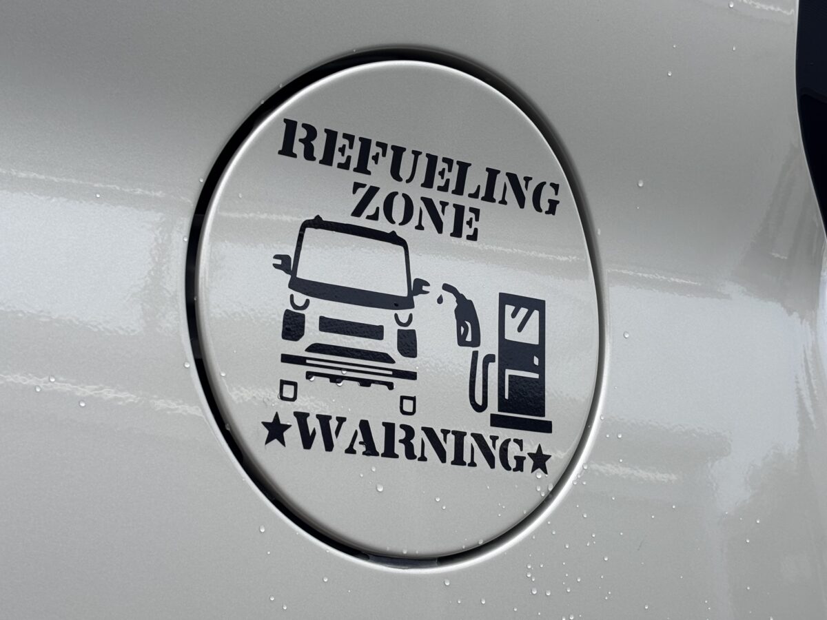 フロントグリルのオレンジのマーカーはランドリックジャパン。給油口のステッカーはメルカリで購入しました」