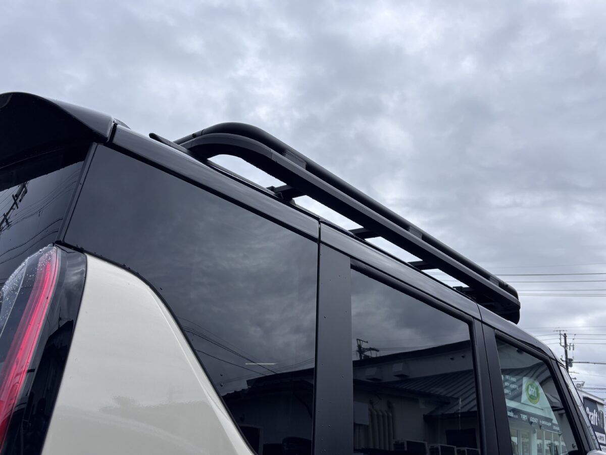 「ルーフラックはオートフラッグス。デリカミニ専用品です。フロントの“DELICA”の立体文字は中を黒くして目立たせています」