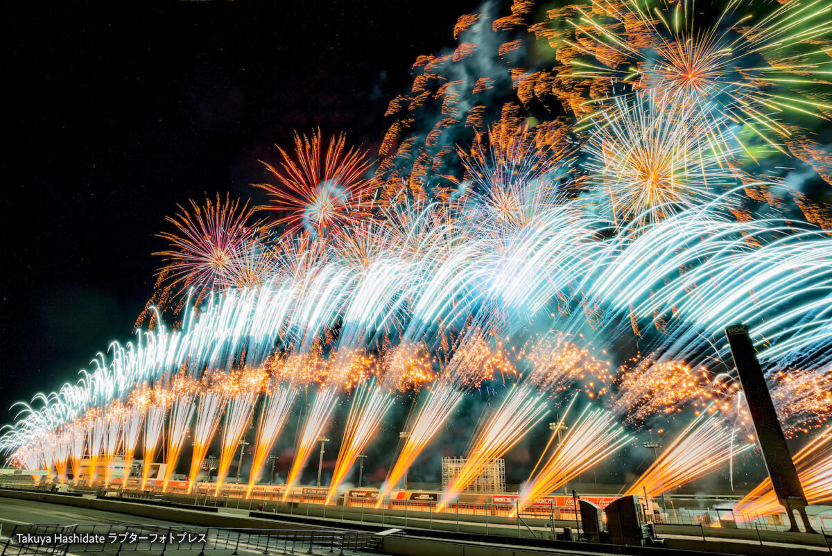 豊かな自然に囲まれたサーキットの夜空を舞台に、鮮やかな花火が音楽に合わせて目線の高さと上空の2画面で打ちあがる劇場型花火を鑑賞いただけます。花火を手がけるのは、全国花火競技大会において優勝・上位入賞の常連であり、創業150周年を迎える「菊屋小幡花火店(群馬県)」。老舗煙火店の匠の技で、1つ1つ丁寧に作り上げた日本最高峰の花火をお楽しみいただけます。
