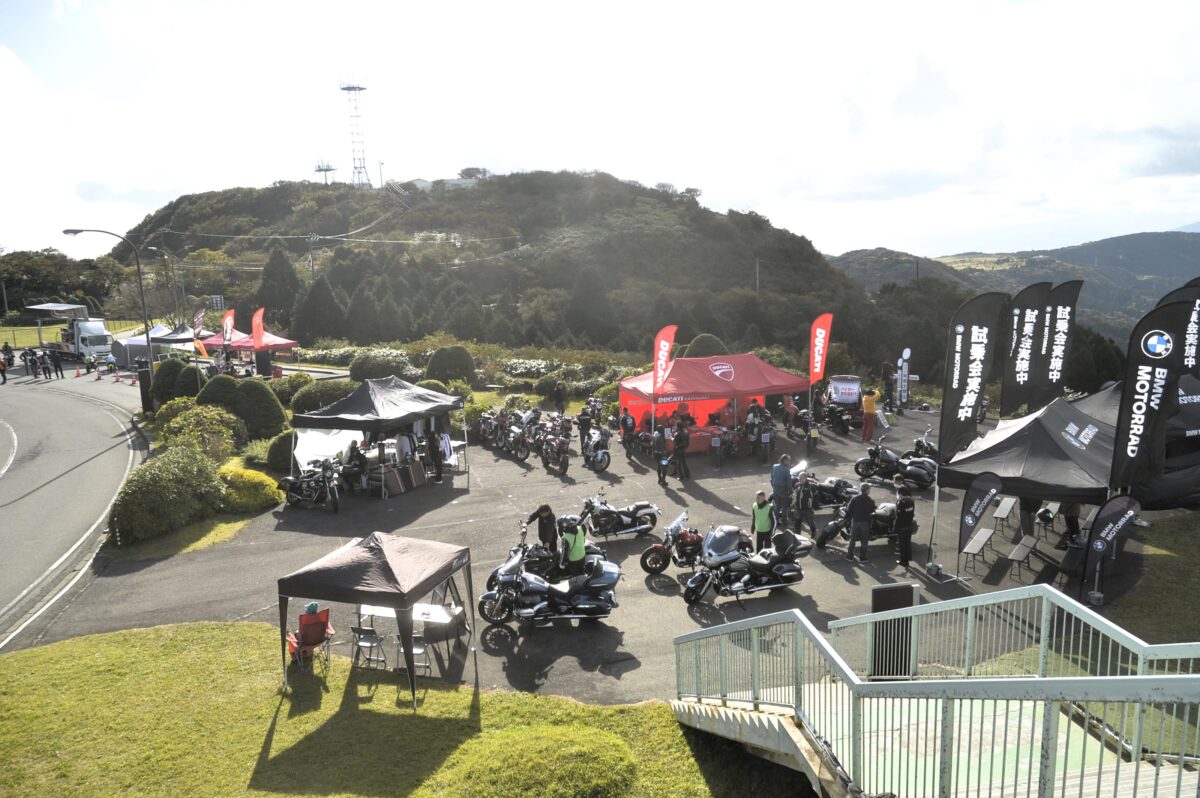 Moto Riders Festaは元レーシングライダーの加賀山就臣さんが理事長を務める一般社団法人MRSモトライダースサポートが主催するイベントで、現役のレーシングライダーや著名人たちが集結し、公道を貸し切ってのデモランやトークショー、用品&パーツメーカーや用品ショップのブース出展、さらにキッチンカーも準備してライダーが丸一日楽しめるコンテンツを満載。初開催の昨年は約3700人の観衆を集め、好評だったこともあり、今年はさらにパワーアップ。メイン会場をバイカーズパラダイス南箱根及びアネスト岩田ターンパイク箱根伊豆連絡線とし、昨年も会場としたアネスト岩田スカイラウンジ、さらに今回は、三島の新名所として人気を呼んでいる三島スカイウォークも加え、3会場同時イベントとして開催する運びとなった。