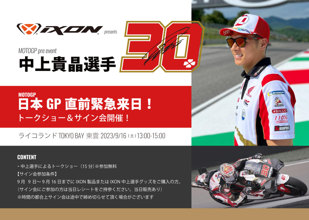 IXON Japan Officeは、2023年9月16日(土)に、日本人唯一のMotoGPライダー中上貴晶選手をゲストに迎えたプレイベントを開催すると発表した。中上貴晶選手が、ライコランド TOKYO BAY 東雲にてトークショーとサイン会を行うというもの。サイン会は、2023年9月9日(土)~9月16日(土)14:30までにIXONブランド製品または応援グッズを購入したユーザーのみ参加が可能となっている。日本GP前に中上貴晶選手に会えるチャンス!この機会にIXON製品や応援グッズを購入してサインを貰おう。