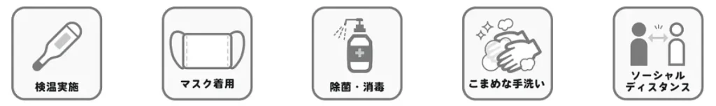 お客様および当社スタッフや地域の皆様に対して、国や自治体・各業界の対策ガイドラインの元、当面の間、感染症予防のために以下の基本対策を徹底し、安心してご利用いただけるよう取り組んでまいります。