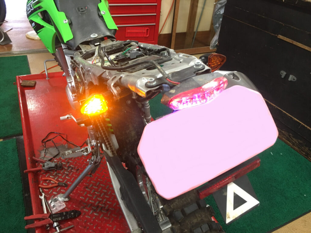 前後のウインカーをLEDに変更。ノーマルと比べてシャープな形状で、明るさも従来よりUP(したような気が……)。テールはフェンダーレスに変更。泥ハネはノーマルよりも多くなってしまったが、見た目のスポーティさが増しているので個人的には大満足。