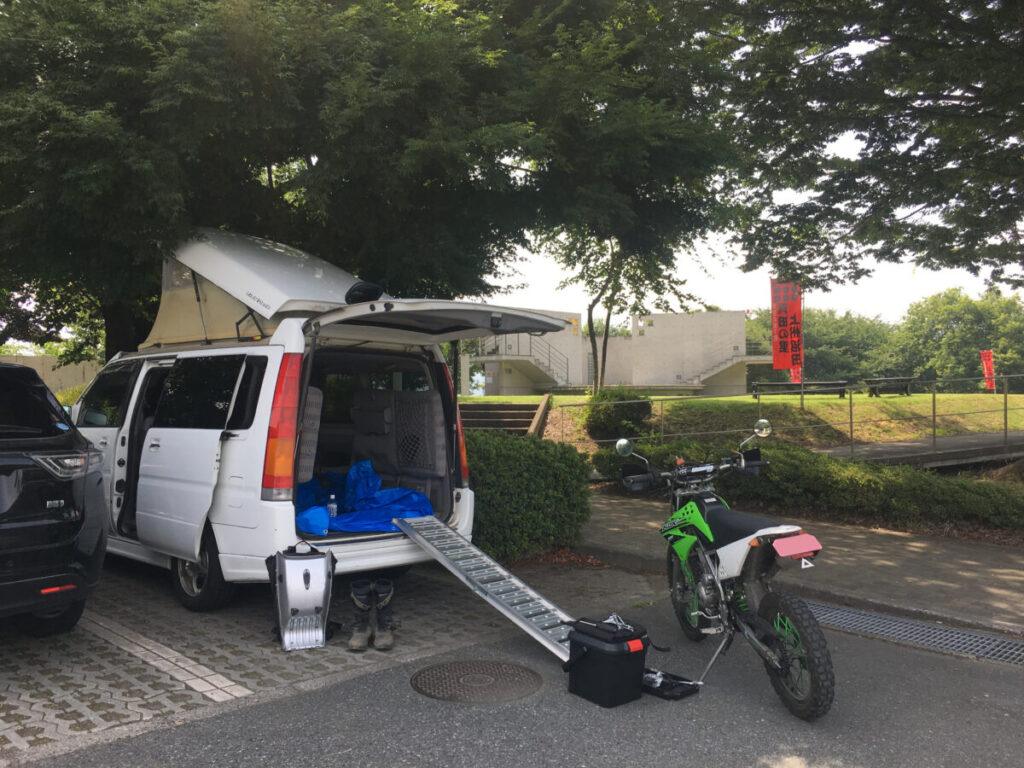 コンパクトなボディに加えミラーを可倒式にしているので、フロントサスをラチェットベルトで縮めれば、天井にハンドルが当たることなく積載できる。ミニバンに積載して林道ツーリングに行くマシンとしては最適!