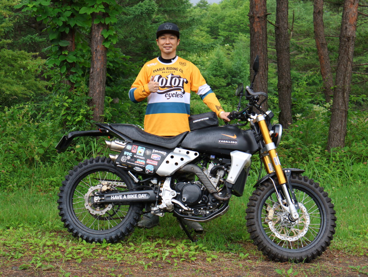 「前後19インチのフラットトラックスタイルのタイヤが気に入ったスクランブラー・フラットトラック250ですが、やっぱり林道の難所ではノーマルタイヤではどうにもならないところがあってブロックタイヤを履かせちゃいました。本来、そういうことをするバイクじゃないのはわかってるんですけどつい楽しくてね。調子に乗ってジャンプしていたら。リヤショックをダメにしちゃったこともあります」と笑いながら話す加藤ノブキさん。