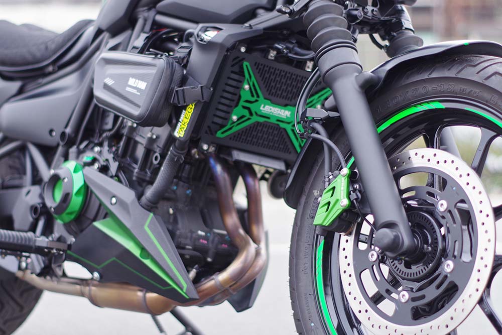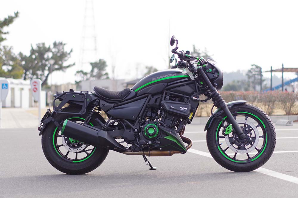 このバイクではカワサキカラーのグリーンを使用して随所にアルマイトパーツを取り付けています。