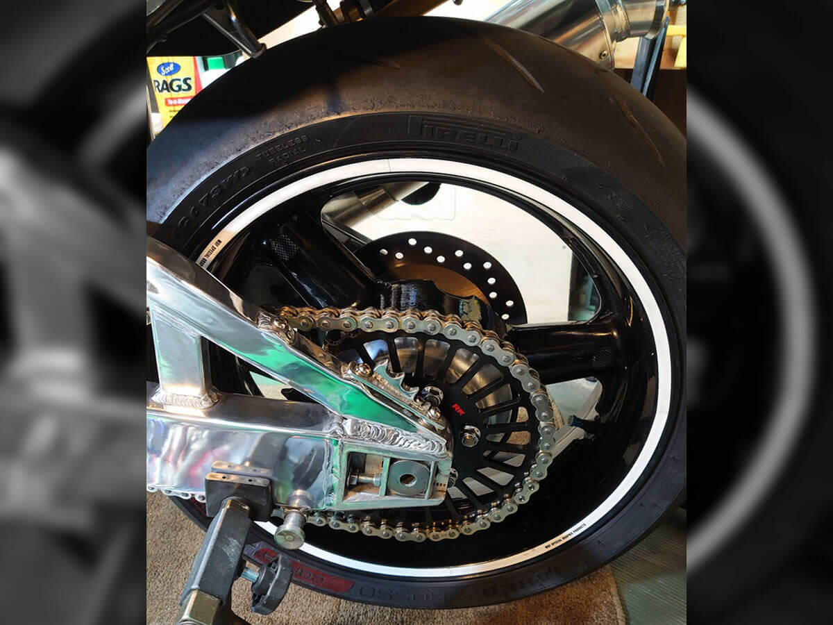 カラーリングは自家塗装で仕上げました。モチーフにしたのは、1987年か1988年頃のスズキ耐久レーサーです。さらに、フレームやスイングアームはDIYでポリッシュ加工を施し、各部にはガンコートを自分で塗装しました。