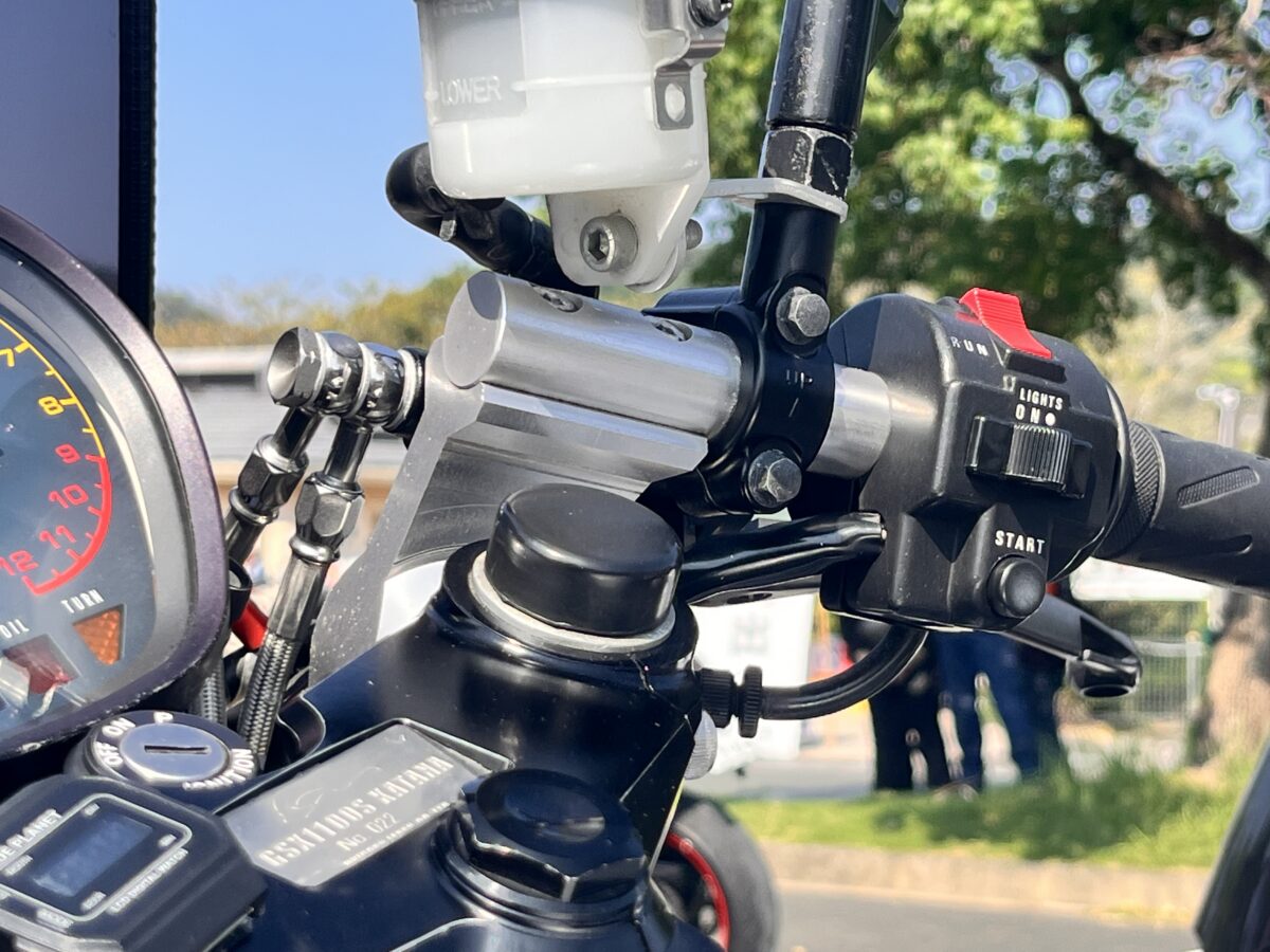 ノーマルブレーキは少々頼りないので、ブレーキキャリパーをブレンボ、ローターをサンスターに交換。