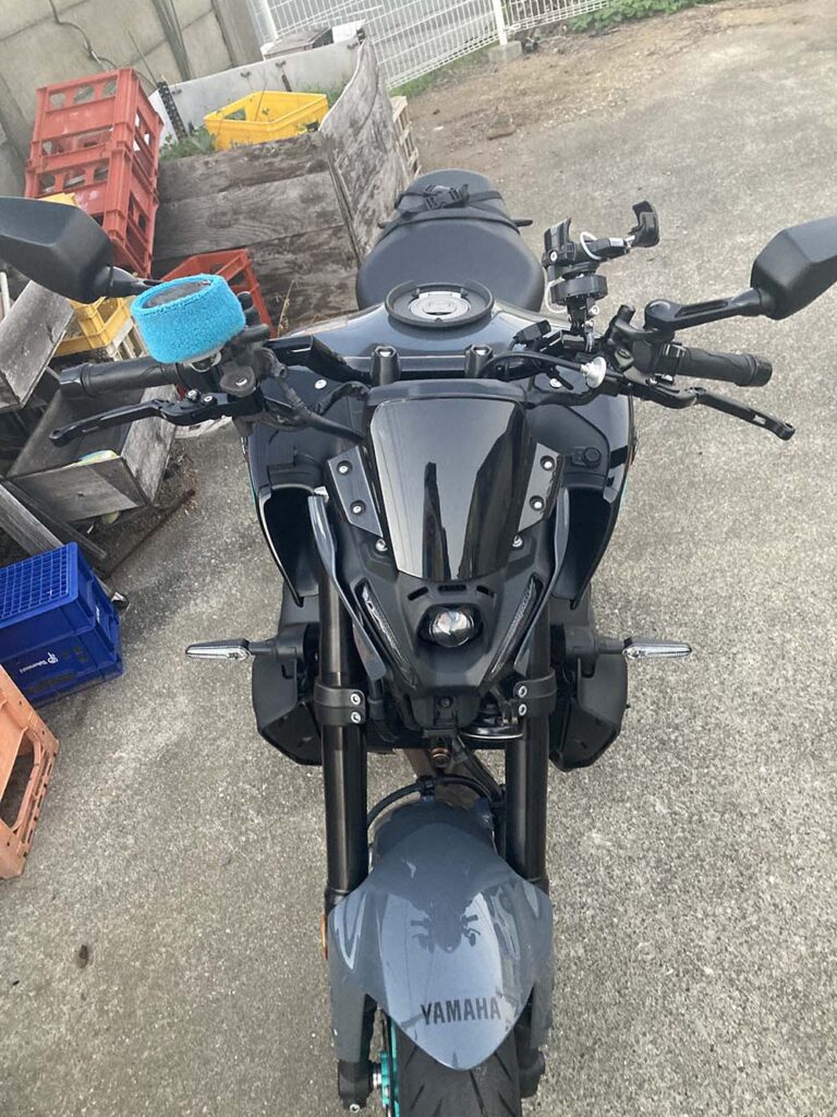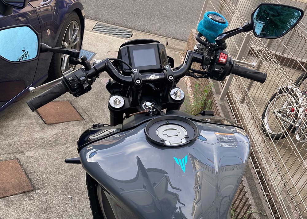 ノーマルハンドルの幅と角度、位置。モタード的なのかな?私にはフィットしないのでハリケーンに交換した。車体カバーの脱着時にウインカーが引っ掛かりポロリしやすい。