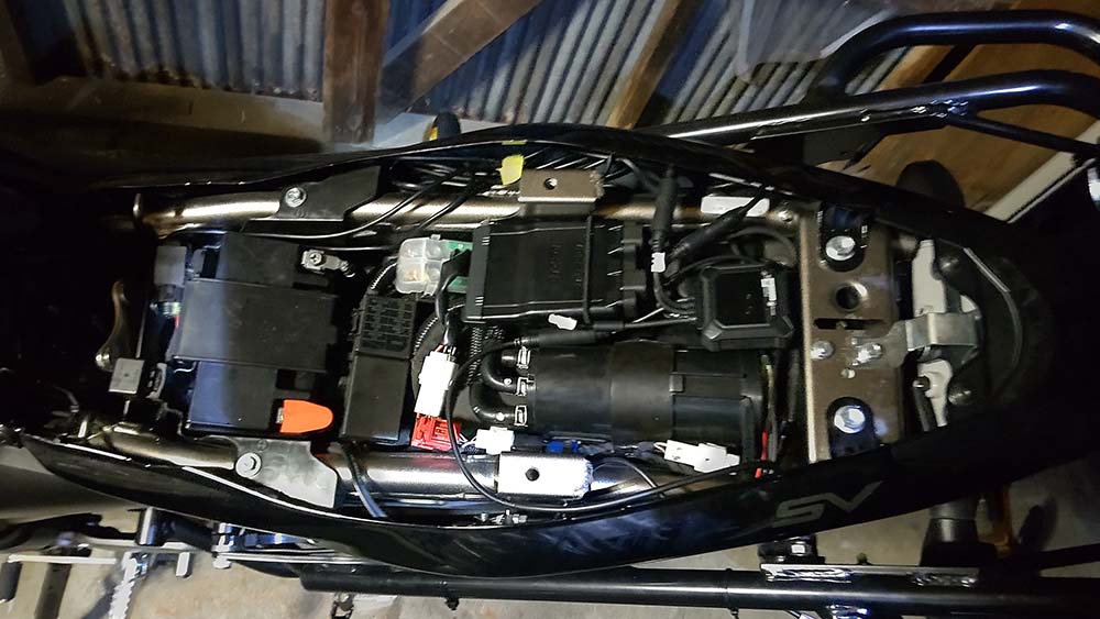 前車がFZ6Sでハーフカウルが着いていて高速走行は楽であったが、ネイキッドバイクは風がモロにくるので、メーターバイザーを装着。SV650の前モデルはハーフカウルが着いているバージョンもあったのに。フルカウルは要らないから、オプションでもハーフカウルが欲しい。