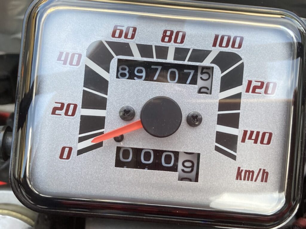 燃料タンクが9.3Lしかない。公称値ではないがメインが7.5Lでリザーブが1.8Lだと思う。燃費が30km/L前後なので約200kmでリザーブに切り替えないといけない。