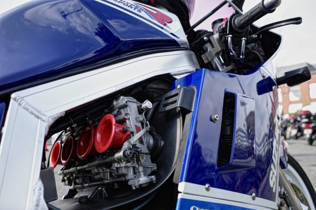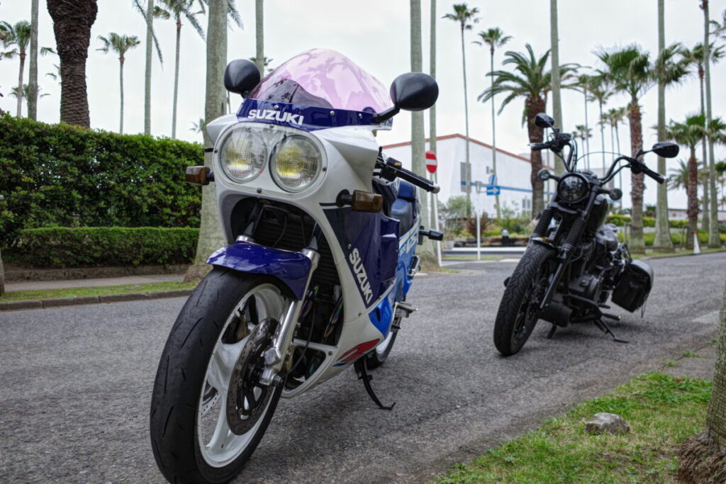 現代のバイクより一回り大きいですが大きさの割には車重が軽く取り回しがしやすい。エンジンに関しては油冷式を採用しており低速からモリモリのパワーで走っていてとても楽しいバイクです!