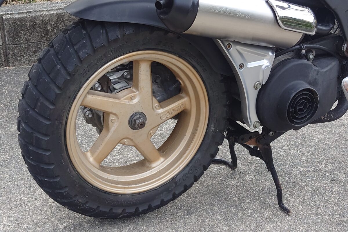 今回紹介している「ストマジ110」に装着されている印象的な12インチのブロックタイヤ。何度も言いますが、カテゴリ的にはスクーターだけどニーグリップや中腰姿勢が可能という不思議な仕様です。